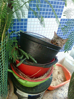 Now is the time I fear so much, tiny lovely baby kittens appear, many get run over by cars, several are put out on the street often separated from their mother (who may or may not be killed by accident or wilfully). Well meaning folks all too frequently leave the tiny ones at my door step. Unfortunately I haven't got a sanctuary, a garden, only two terraces and cats that feel already that my "family" is getting too big. Besides, I still need to be able to cope, physically and financially. As I don't let my little treasures out on the street to leave their excrement somewhere there, I have my daily toilet cleaning work and to buy quite a bit of sand for the toilets. Anyhow, it remains depressing for me being unable to help all cats in need. Having decided that no more additions are possible, my new arrivals are: lovely white (with a bit of black, looking quite cheeky like the cat from a well known cartoon here) Leilah, sweet black and brown Natasha, pretty black and white Natalie, precious brown and black streamed Rachida (one eye missing that is why I at first thought she's one of mine already and just ran out). The very latest, not very well orphan Daniel, lovely white cat with blue eyes, the only survival of his family, as a charming well educated lady from the neighborhood told me. She feared that should he die as well it would depress her young boy who would love to save all cats, just like me. Schlawiner sometimes sleeps on top of my letterbox I discovered or my awnings, cheeky lad, as long as he doesn't climb on top of my roof and create a lot of unrest there. Because of him I had almost all my lady cats neutered. Some are too young and as Diana is suffering from a chronic cold I have a problem. Giving her the anaesthesia could turn out to be fatal. It is now really hot here I was hoping there would be no more sneezing, running noses... Since cats have no handkerchief they clean their faces and noses with their tongue, not at all ideal and I am not always there to use tissue instead (they hate this). In some cases the cold has become chronic unfortunately. I can't afford vaccine for my big family, so sad. My vet afford a good price in view of their number but it is still too much.